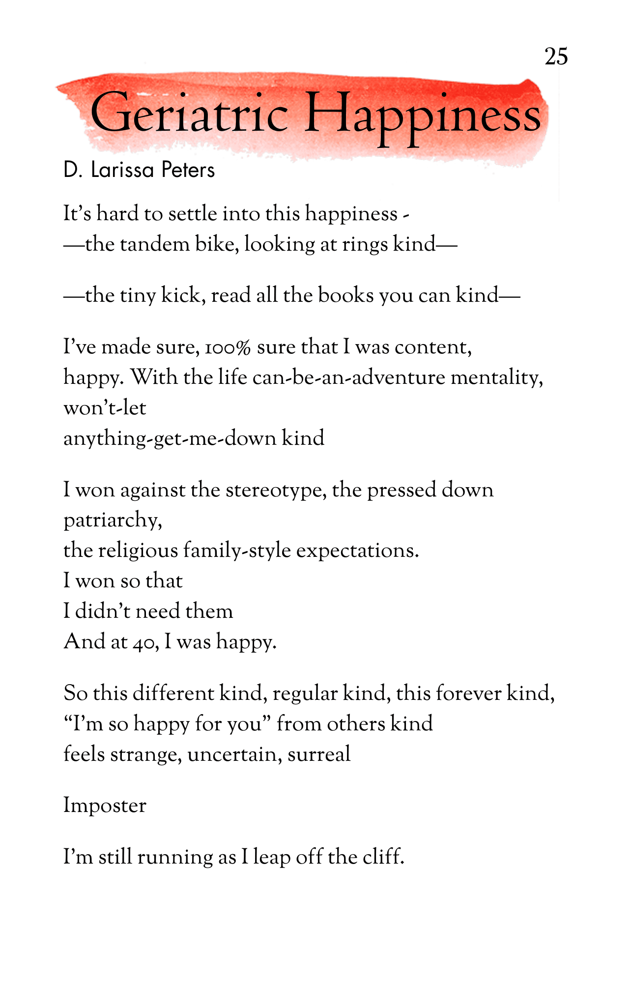 D Larissa Peters grew up in Indonesia and has been somewhat of a nomad. After meandering around the East Coast for more than 10 years, she now resides in California. Her most recently published poems have appeared in Eastern Iowa Review, Onyx Etched Magazine, and a few forthcoming pieces elsewhere.