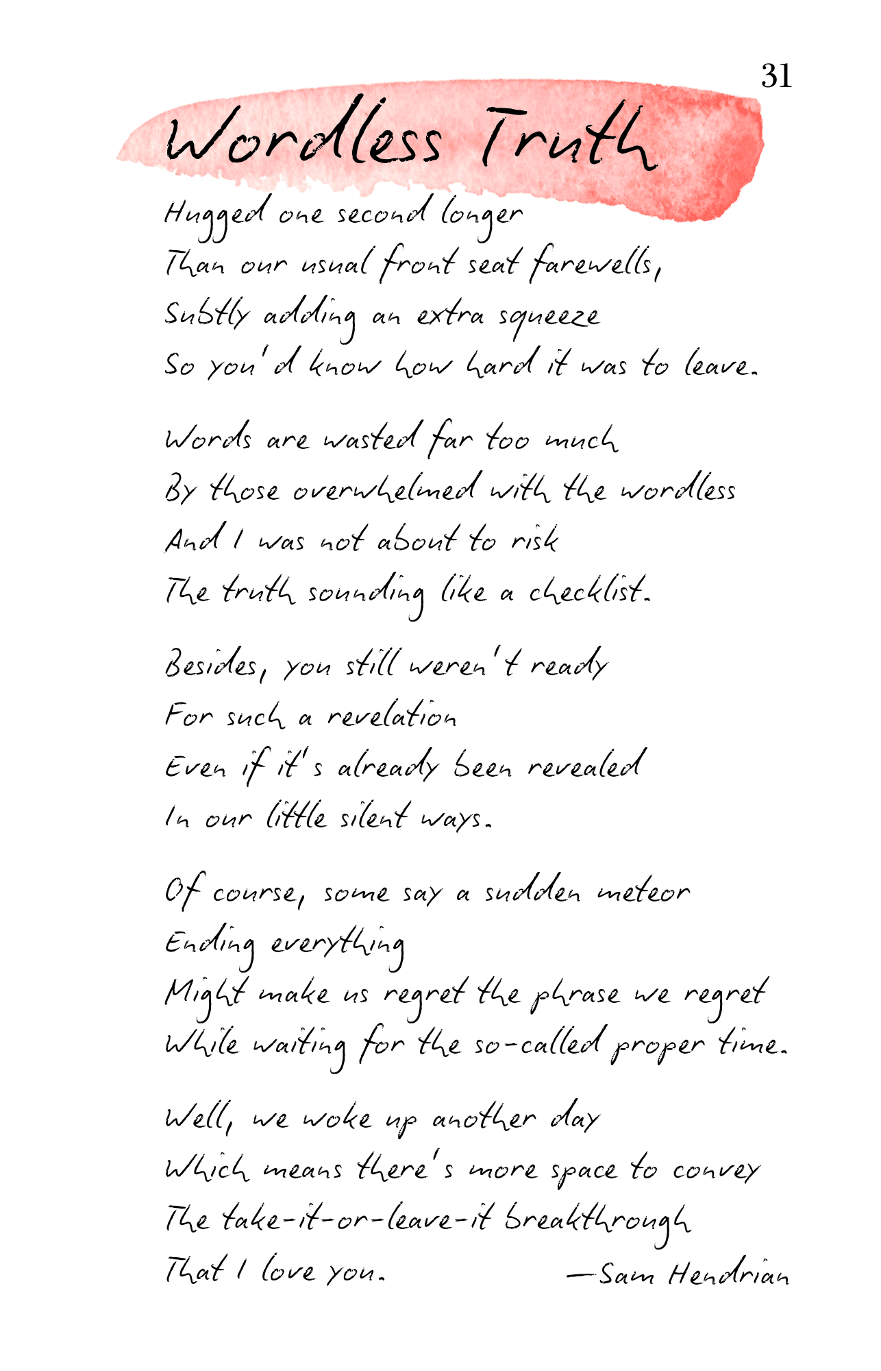 Sam Hendrian is a lifelong storyteller striving to foster empathy through art. He resides in Los Angeles, where he primarily works as a poet/independent filmmaker and makes at least one movie per month.